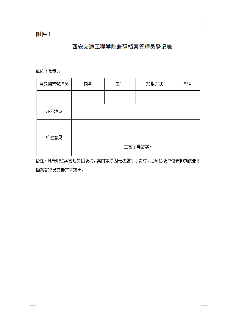 请各单位高度重视,按要求认真推荐兼职档案管理员,于3月23日(周四)17:30前将本单位兼职档案管理员登记表报送108办公室,表格见附件1。