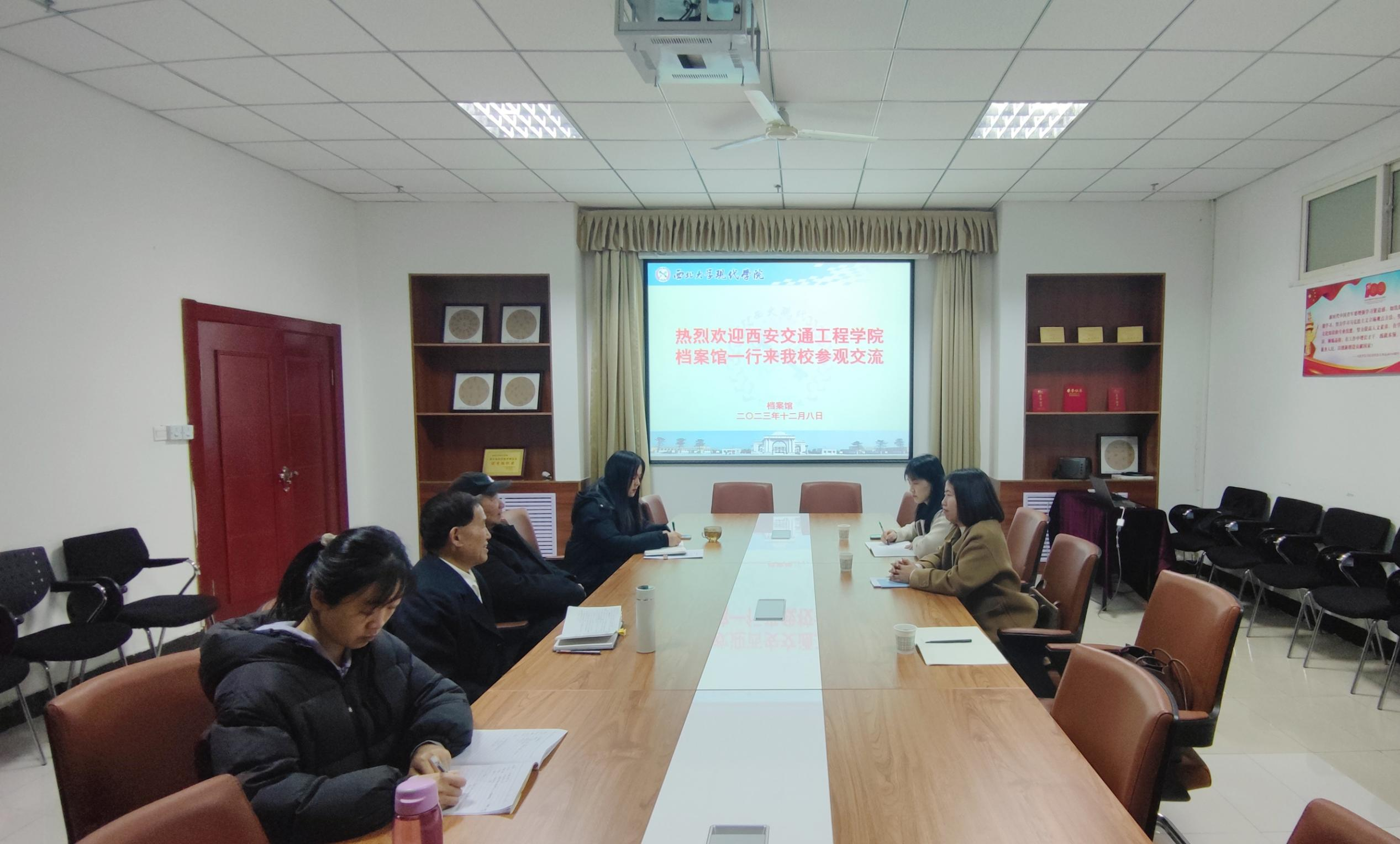 为深入学习贯彻习近平总书记关于档案工作指示批示,学习其他院校先进经验,进一步完善我校档案馆建设工作,2023年12月8日,我校档案馆馆长黄晓燕一行3人前往西北大学现代学院档案室进行调研学习,西北大学现代学院档案室对我校来访给予热情接待,并组织了座谈会,现代学院副校长李彦亭教授参加了座谈会。